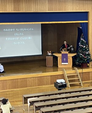 川上先生は、随所にスライドを活用して話してくださいました。最後にはご自身のギター伴奏で「小さなキャンドル」という歌で締めくくられました。暗闇の中での希望、神の愛、など第四アドベントとして本来のクリスマスの意味を感じさせる素晴らしいメッセージでした。川上先生ありがとうございました。