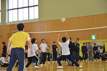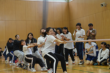 悪天候のため、屋外での競技は中止となってしまいましたが、体育館の中でソフトバレー、玉入れ、綱引き、リレーを行い学生間の親睦を深めることができました。